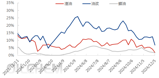 截止12月5日,山东油浆市场库存率6.8%,较上周期跌5.7个百分点。山东地区渣油库存率1.9%,较上周期跌2.3个百分点,山东地区蜡油库存率1.7%,较上周期跌0.3个百分点。