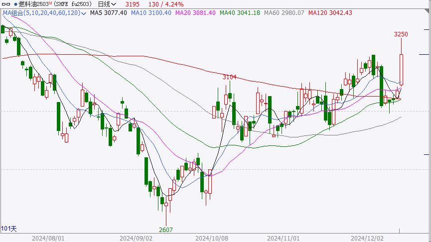 受国际原油价格上涨影响成本支撑增强,同时炼厂库存低位,供应收紧,燃料油价格持续大幅上涨,盘中最大涨幅一度接近6%,创9月以来新高。尾盘略有回落,2503主力合约收在3195元/吨,涨幅4.11%。