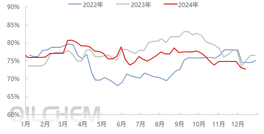 截止12月12日,本周期内主营炼厂常减压产能利用率为72.72%,环比下跌0.46%,同比跌2.44%,福建联合及大榭开工后提负荷,但广西石化检修,且部分炼厂降低日均加工负荷,最终收降。