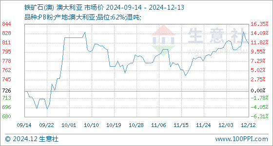 12月13日生意社铁矿石(澳)基准价为809.33元/吨