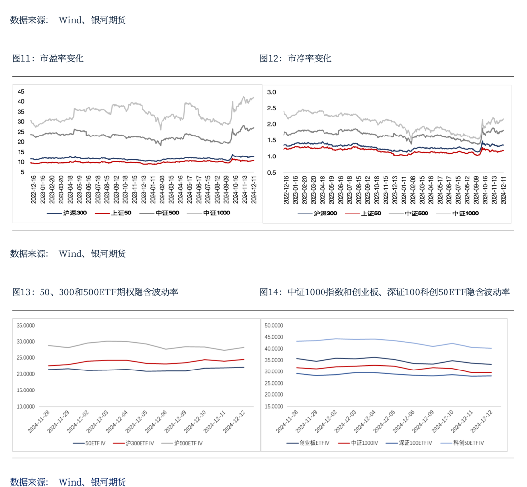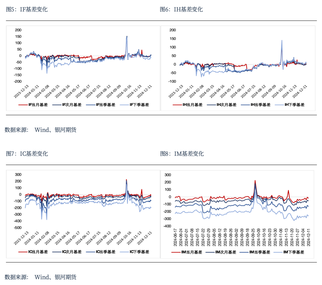 股指期货随现货上涨,至收盘,主力合约IH2412涨1.07%,IF2412涨1.08%,IC2412涨0.87%,IM2412涨0.71%。各品种基差继续小幅上行,IF和IH升水创近期新高。IC、IF、IH和IM成交分别增加1.6%、22.8%、14%和0.8%,持仓分别增加2.4%、8%、4.3%和0.8%。