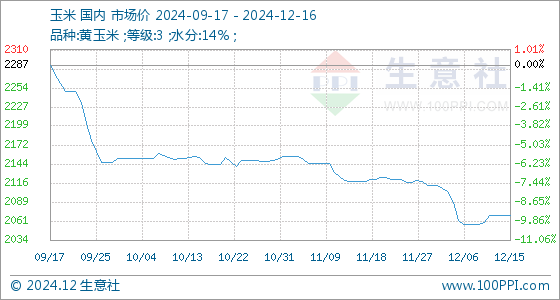 12月16日,生意社玉米基准价为2070.00元/吨,与本月初(2112.86元/吨)相比,下降了-2.03%。