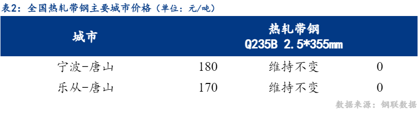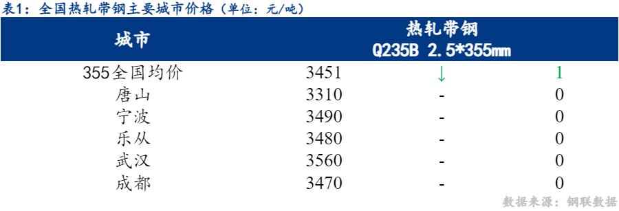 24日热轧带钢全国主要城市价格持稳运行,截至发稿时2.5*355mm热轧带钢均价3451元/吨,较昨下降1元/吨,其中2.5*355mm主要城市报价为唐山3310元/吨,宁波3490元/吨,乐从3480元/吨。