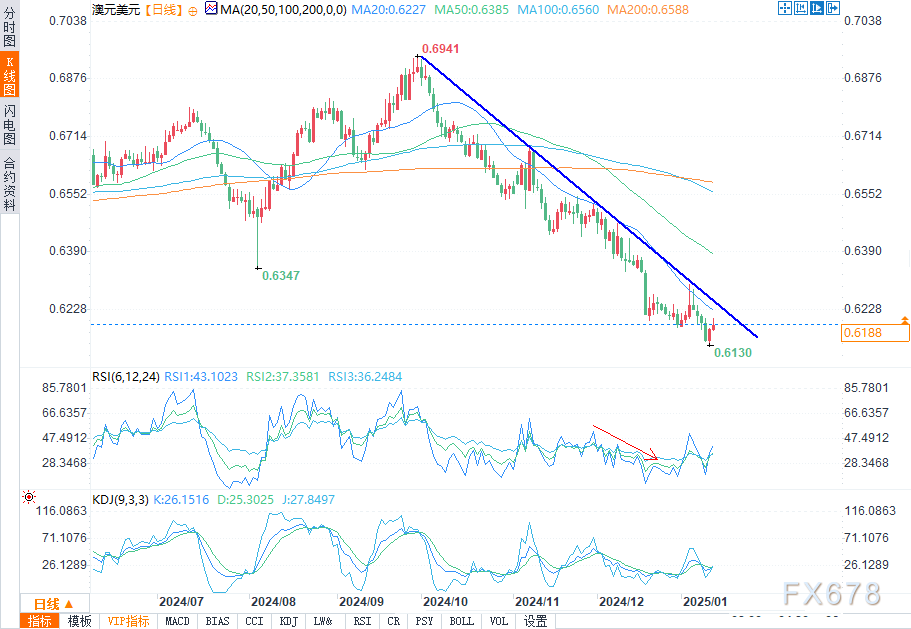 如果跌破0.6132低点,可能会看向2008年10月的低点0.6009。若要使潜在的看涨反转获得动力,需要突破1月6日的高点0.6302。