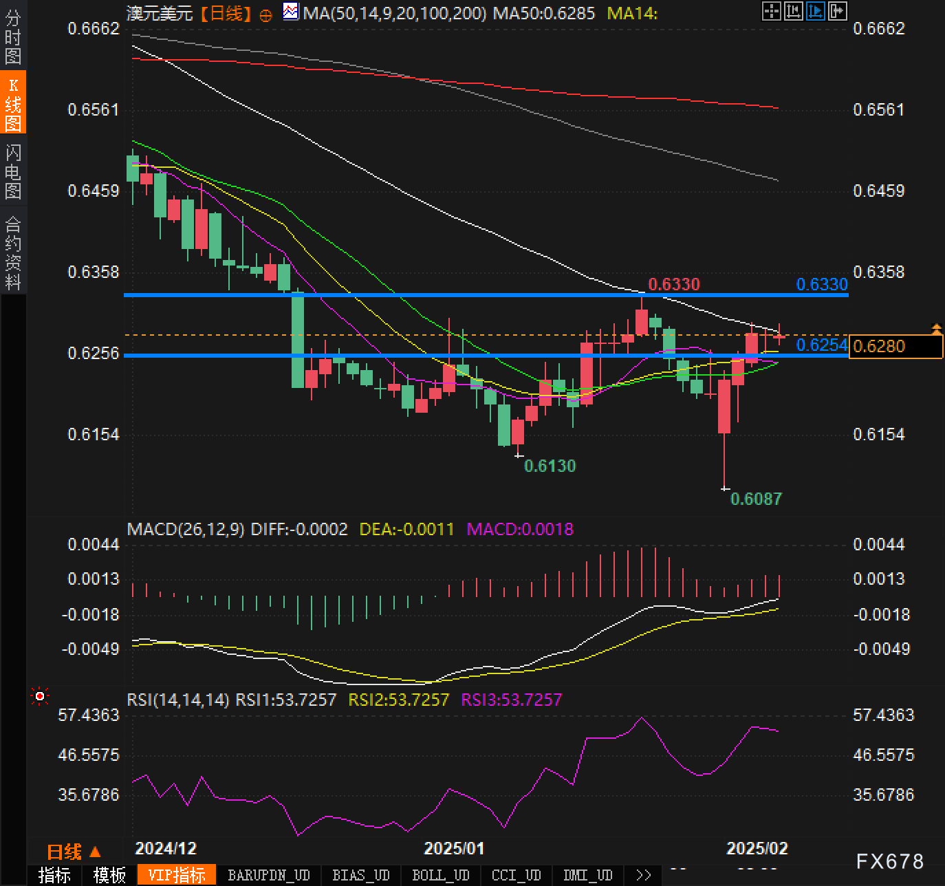 总体来看,当前澳元/美元的技术面表现出一定的短期上行动能,尤其是在9日和14日均线支撑下,短期内看涨的趋势仍然占主导。然而,基本面方面的利率预期以及全球经济环境的变化仍然为澳元带来一定的不确定性。市场关注未来几天可能出现的技术突破和基本面的变化,特别是在澳洲联储的利率决定之后,澳元/美元的走势可能会迎来更加明确的方向。