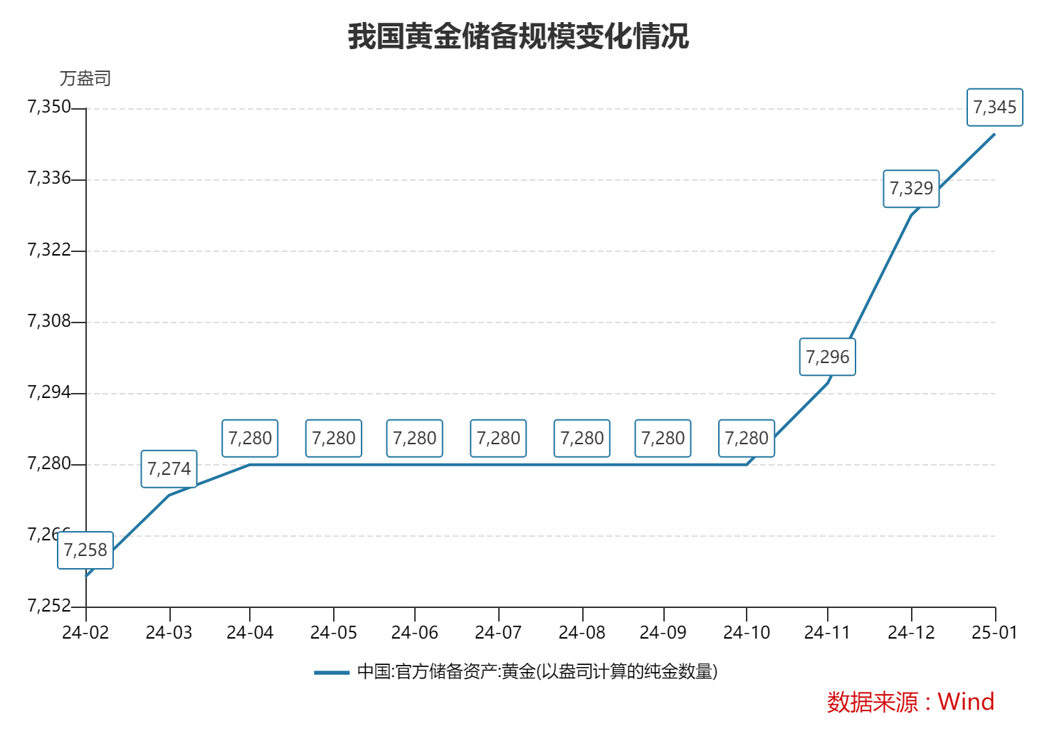 2025年1月末黄金储备规模为7345万盎司,2024年12月末为7329万盎司,环比有所上升。