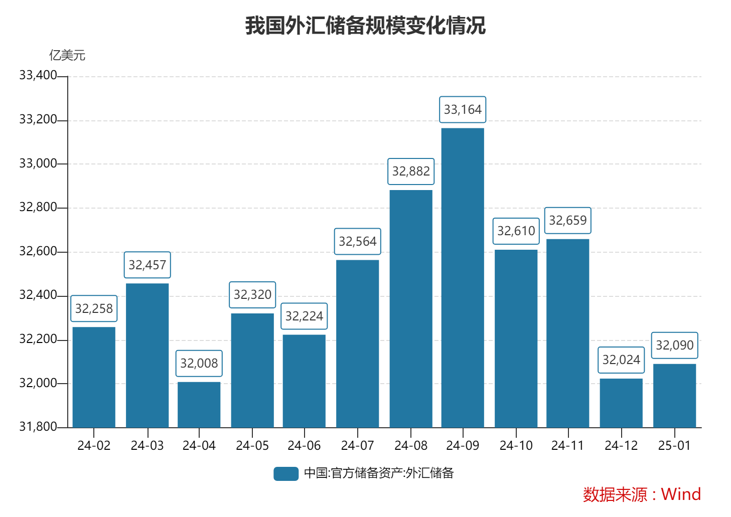 国家外汇管理局统计数据显示,截至2025年1月末,我国外汇储备规模为32090亿美元,较2024年12月末上升67亿美元,升幅为0.21%。