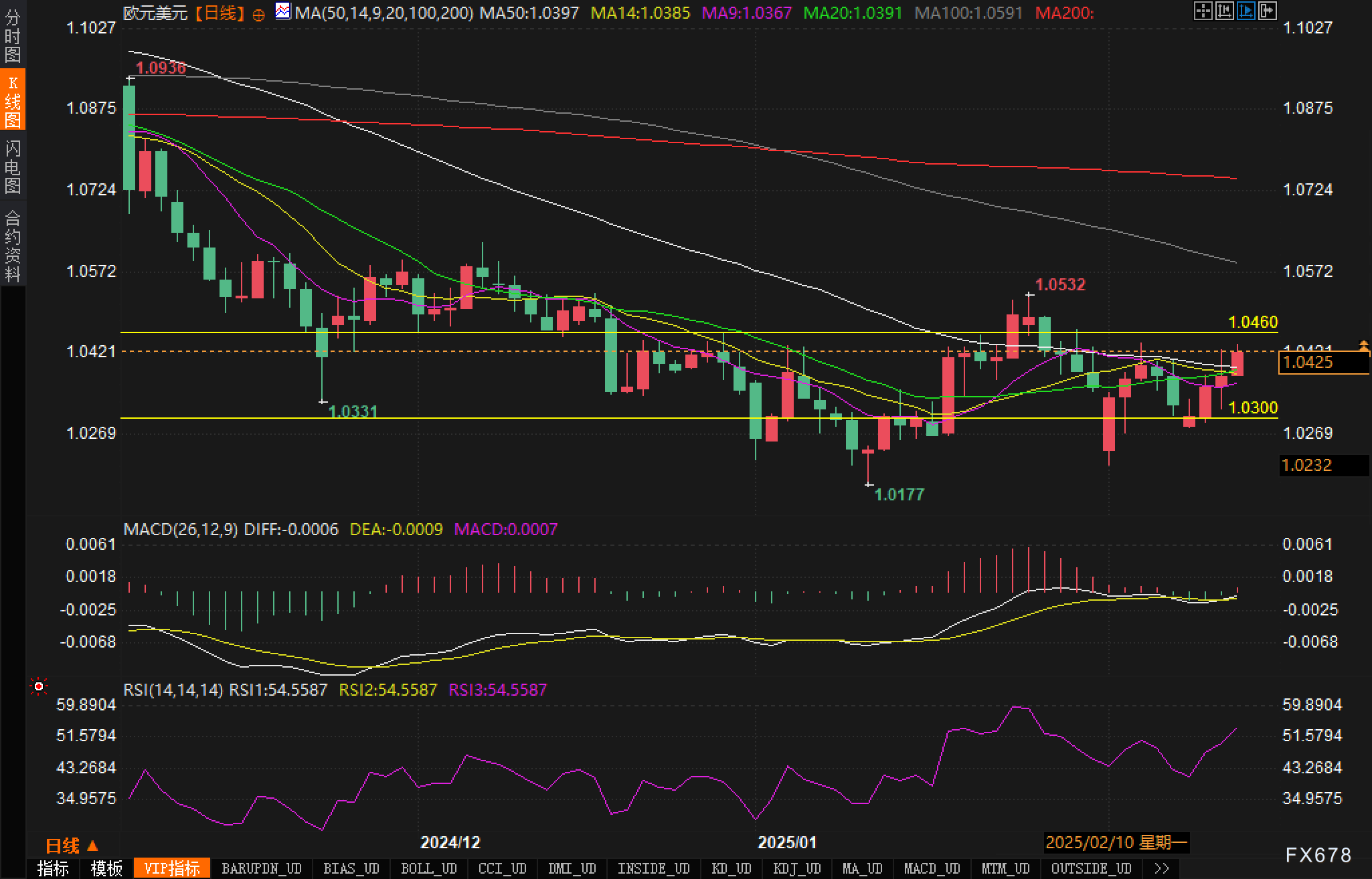 从技术面来看,欧元/美元在短期内的上涨仍面临一定的挑战,主要是由于多重技术指标的表现不一。首先,欧元/美元的价格已经突破1.0400,并且持续在50日均线附近震荡整理。当前市场的情绪偏向谨慎,尽管欧元有所反弹,但价格接近技术阻力位,可能会面临回调压力。