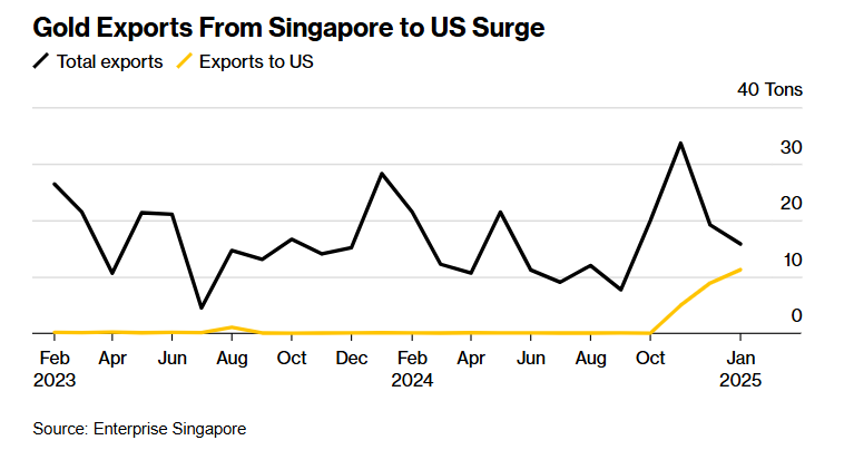 亚洲重要贸易国家新加坡对美国的黄金出口规模在1月攀升至近三年来的最高水平,这一统计数据进一步表明特朗普加征关税引发全球新一轮贸易战所带来的无比浓厚避险投资情绪,带动关键市场价格差异,并且已经引发全球黄金贸易层面的剧烈波动。这个亚洲城市国家对于美国的金条出口规模已经创2022年以来新高,纽约与伦敦黄金市场价差扩大——主要受特朗普加征关税政策带来的避险情绪推动,黄金加速流向美国。