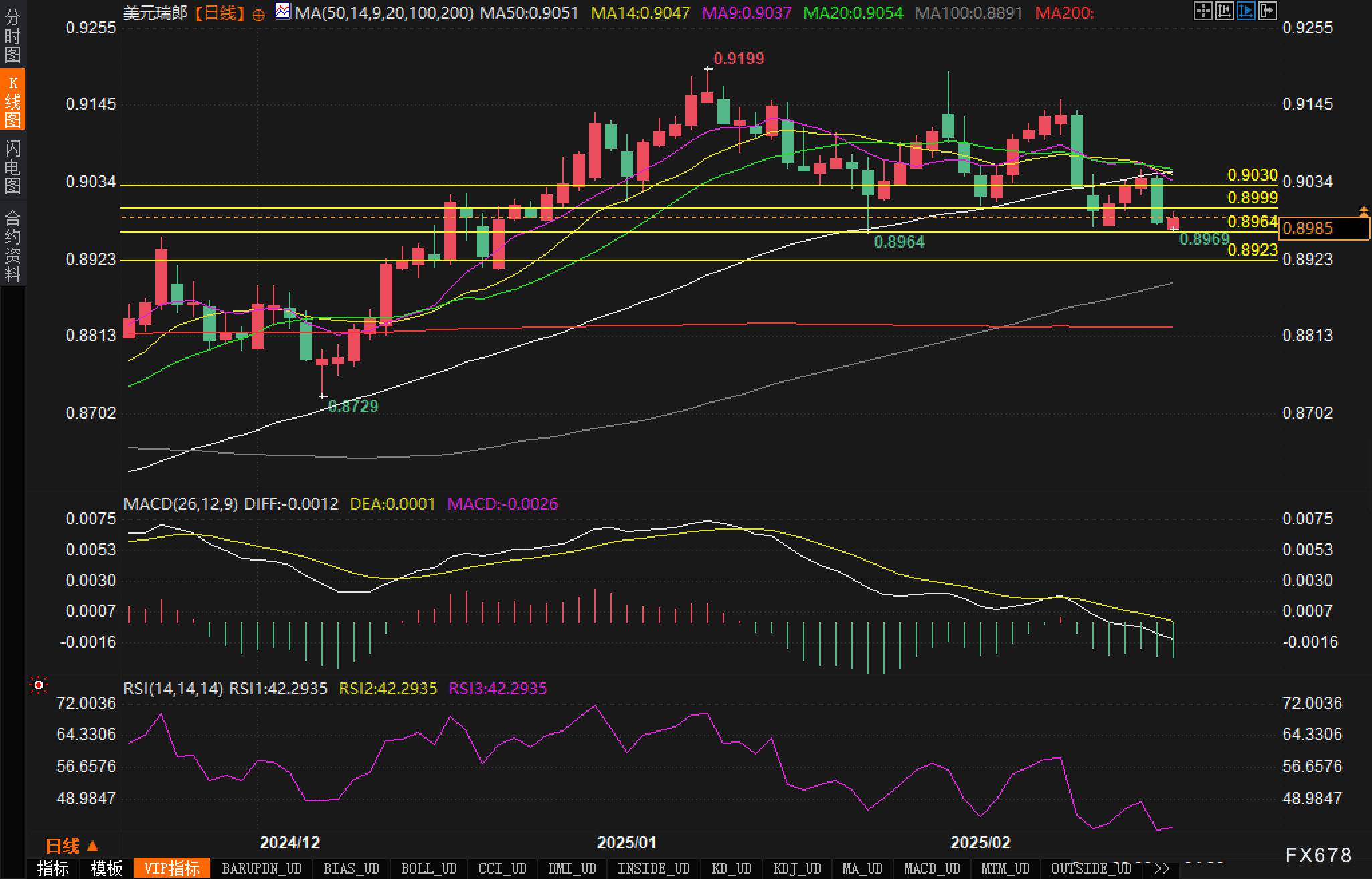 总体而言,美元/瑞郎在当前阶段表现出一定的反弹动力。虽然市场面临诸多不确定性,但从技术面来看,价格存在进一步上行的可能。关注0.8964和0.8999两个关键技术水平的突破情况,以判断市场的下一步走势。同时,美联储官员的讲话和美国经济数据的发布也将对短期内的市场情绪和走势产生重要影响。