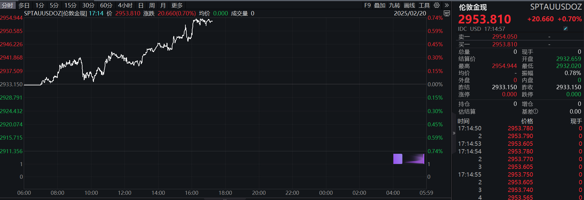2月20日,现货黄金盘中站上2950美元/盎司关口,再创历史新高。截至记者发稿,伦敦金现微涨0.7%,报2953.81美元/盎司。