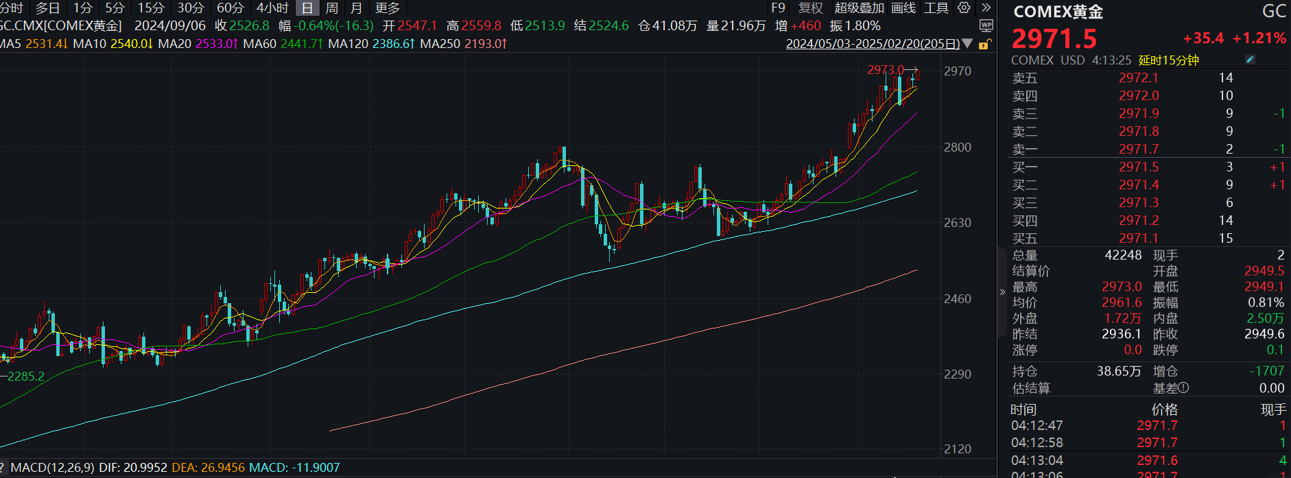 期货方面,COMEX黄金盘中站上2970美元/盎司关口,盘中触及最高点2973美元/盎司,再创新高。截至记者发稿,COMEX黄金上涨1.21%,报2971.5美元/盎司。