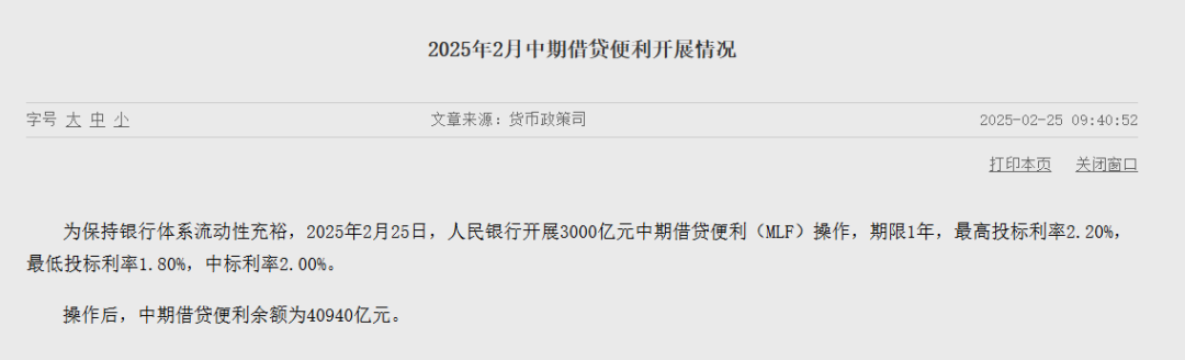 同日,为保持银行体系流动性充裕,人民银行开展3000亿元中期借贷便利(MLF)操作,期限1年,最高投标利率2.20%,最低投标利率1.80%,中标利率2.00%。操作后,中期借贷便利余额为40940亿元。