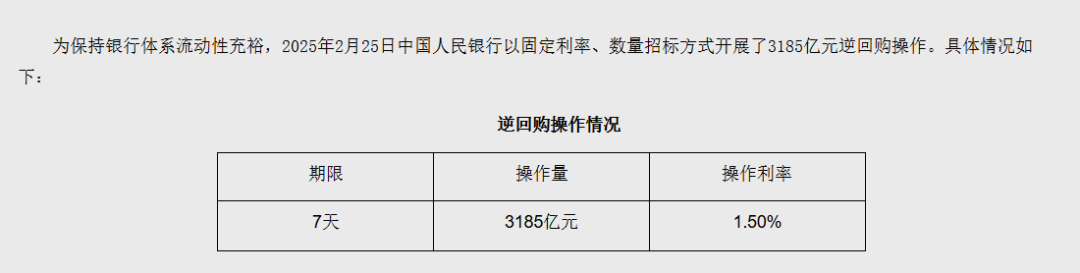 中国人民银行网站消息,为保持银行体系流动性充裕,2月25日中国人民银行以固定利率、数量招标方式开展了3185亿元逆回购操作。因当日有4892亿元7天期逆回购到期,实现净回笼1707亿元。