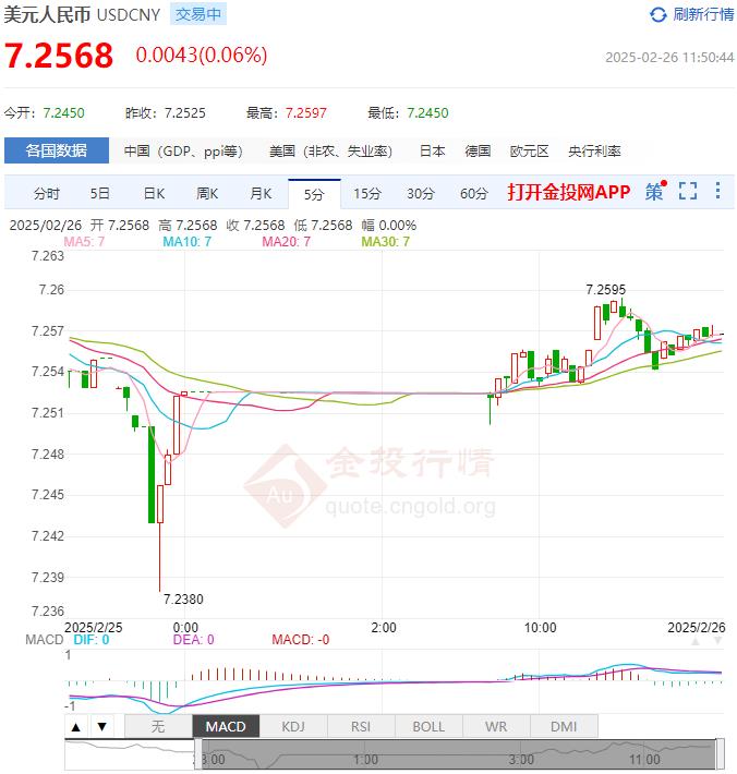 截至发稿,美元兑换人民币汇率报价7.2568,涨幅0.06%,最高价7.2597,最低价7.2450,今日美元/人民币汇率开盘价7.2450。