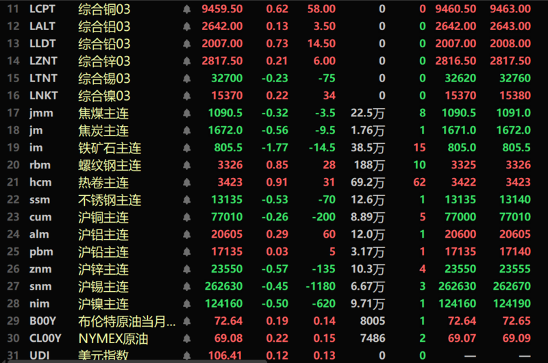 黑色系多飘绿,铁矿跌1.77%,螺纹涨0.85%,热卷涨0.91%,不锈钢跌0.53%。双焦方面,焦煤跌0.32%,焦炭跌0.56%。