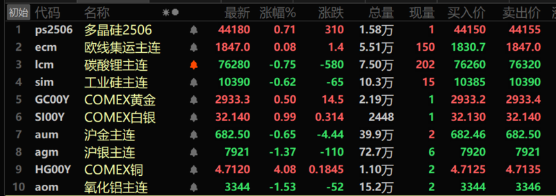此外,氧化铝跌1.53%。碳酸锂跌0.75%,工业硅跌0.62%。多晶硅主力期货涨0.71%。
