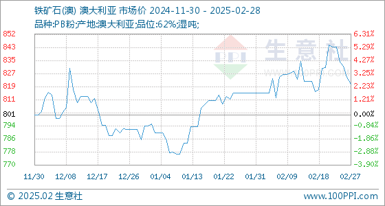 2月28日生意社铁矿石(澳)基准价为821.00元/吨