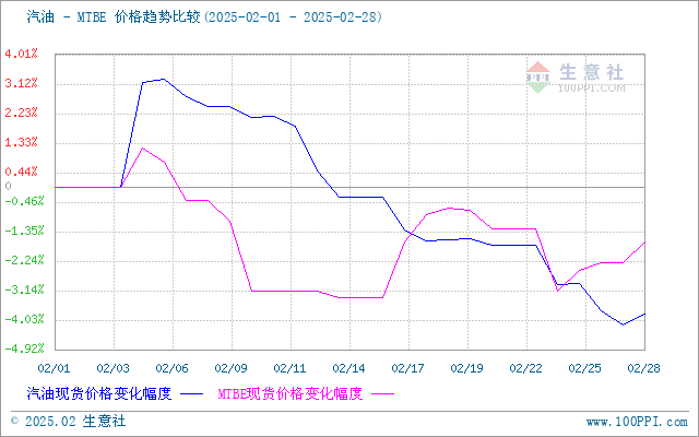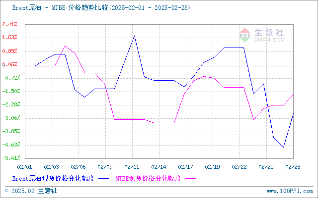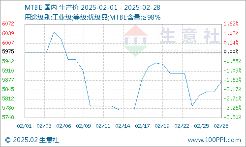 据生意社商品行情分析系统,国内MTBE市场行情偏弱整理。2月1日至28日,MTBE价格自5975元/吨下跌至5875元/吨,周期内价格跌幅1.67%,价格同比下跌11.32%。