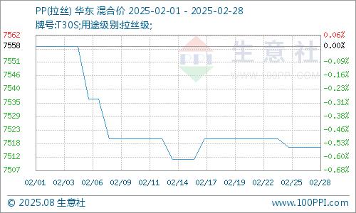 据生意社商品行情分析系统显示,2月PP市场行情走跌后震荡整理,大部分牌号产品价格窄幅下调。截止2月28日,国内生产商、贸易商拉丝主流报盘价格在7516.67元/吨左右,较2月初价格水平涨跌幅-1.49%。