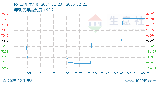 2月21日,生意社PX基准价为7500.00元/吨,与本月初(7300.00元/吨)相比,上涨了2.74%。