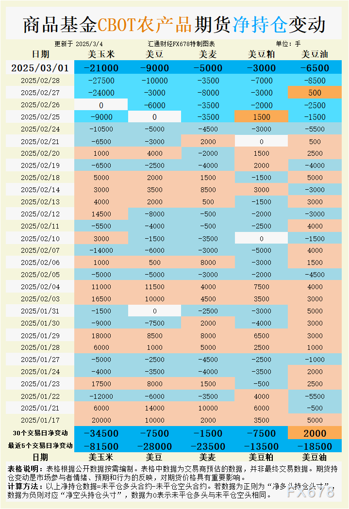 玉米市场在此次行情中跌势最为显著,CBOT玉米5月合约CK25周一跌12-1/4美分/蒲式耳,收于4.57美元/蒲式耳,创下三个月以来的新低。持仓变动显示,基金当日大幅增持净空头,5日净空头激增81500手,30日增34500手,市场对玉米前景的看空情绪极为浓厚。