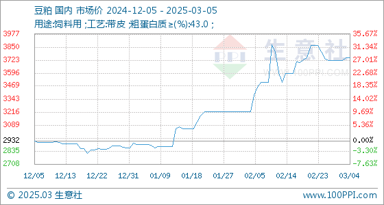 3月5日,生意社豆粕基准价为3744.00元/吨,与本月初(3722.00元/吨)相比,上涨了0.59%。