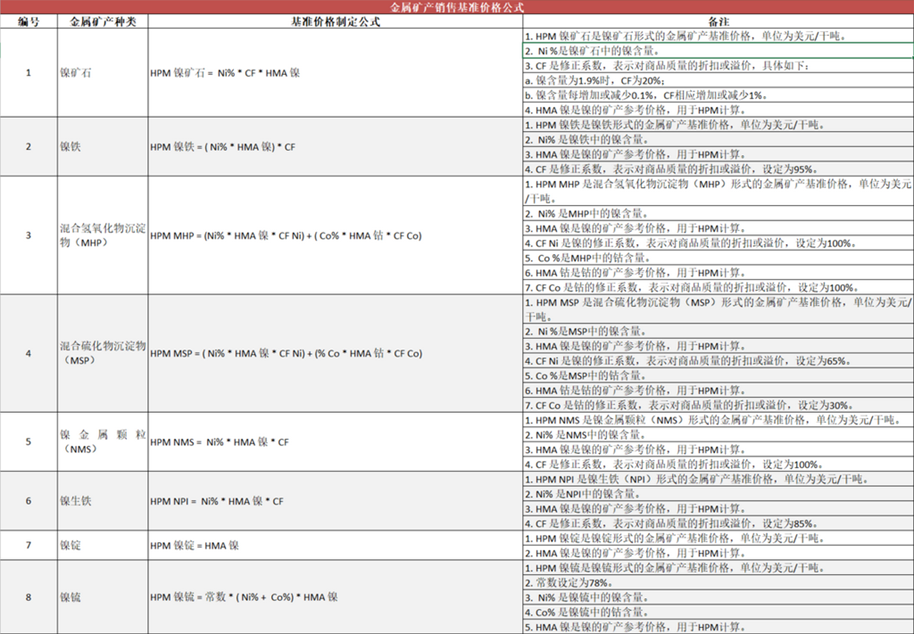 1、镍金属计算方式调整。取消了原有的“取HPM周期前二个月20日至前一个月19日的LME现货结算价格平均值”的计算方式,改为“取HPM周期前一个月的5日至25日的平均值”。据SMM了解,后续HMA价格将由每月初修改一次,改为每月初及月中各修改一次。这将令此前存在的矿端价格变化滞后实际情况有所改善,修改更贴近内贸实际矿价变化。