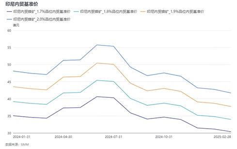 从印尼矿端内贸实际情况来看,矿端阶段略偏紧。据SMM,2月末3月初延续了2月18-19美金的印尼内贸矿升水,3月印尼镍矿主流升水或迎来再次上涨。大K岛园区目前暂定三月份镍矿采购意向价格为19-20美金以上,但大多数腰部火法冶炼厂原料库存仍未达到安全水位,因此,对20美金以上的升水有一定的接受度。矿山在配额有限情况下,倾向于优先出利润较好的火法矿。3月开始,苏拉维西雨季逐渐结束,陆续开港后,预期后续出货量会增加。印度尼西亚镍矿商协会(APNI)发布2025年3月的镍矿内贸基准价格,3月的参考价格为15306.52美元/湿吨,较2月参考价15276.11美元/湿吨上涨约0.2%。其中:NI1.6%MC35%FOB为27.01美元/湿吨,较2月基价上涨0.05美元/湿吨