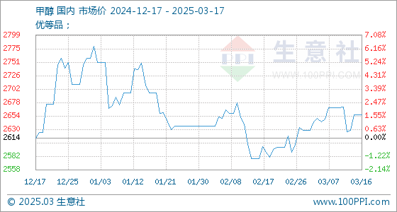 3月17日,生意社甲醇基准价为2656.67元/吨,与本月初(2629.17元/吨)相比,上涨了1.05%。