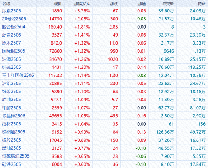 3月20日,午盘收盘,国内期货主力合约涨跌不一。尿素涨近4%,20号胶涨超2%,国际铜、沪铜、原木、沥青、纸浆、沪铝、纯碱涨超1%;跌幅方面,集运欧线跌超5%,菜粕跌超3%,碳酸锂、苹果跌超2%,氧化铝、烧碱、豆粕、生猪、焦炭跌超1%。