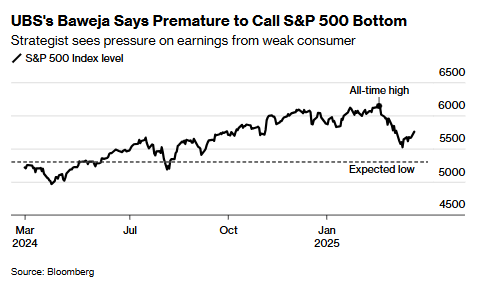 瑞银投资银行首席策略师Bhanu Baweja表示,美国消费者“显露出明显疲态”,这将进一步压制股市表现,可能导致标普500指数再跌8%。