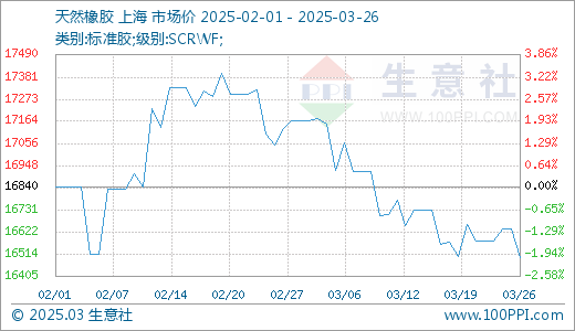 据生意社商品行情分析系统,近日(3.18-3.26)国内天然橡胶现货行情震荡小幅上涨,截至3月26日我国天然橡胶市场现货胶行情在16636元/吨左右,较18日的16571元/吨上涨0.39%,周期内低点16502元/吨,高点在16656元/吨。原料价格高位整理;国内天胶港库库存延续增加;下游开工基本稳定;沪胶行情震荡整理,带动天然橡胶现货行情小幅调整。