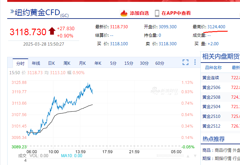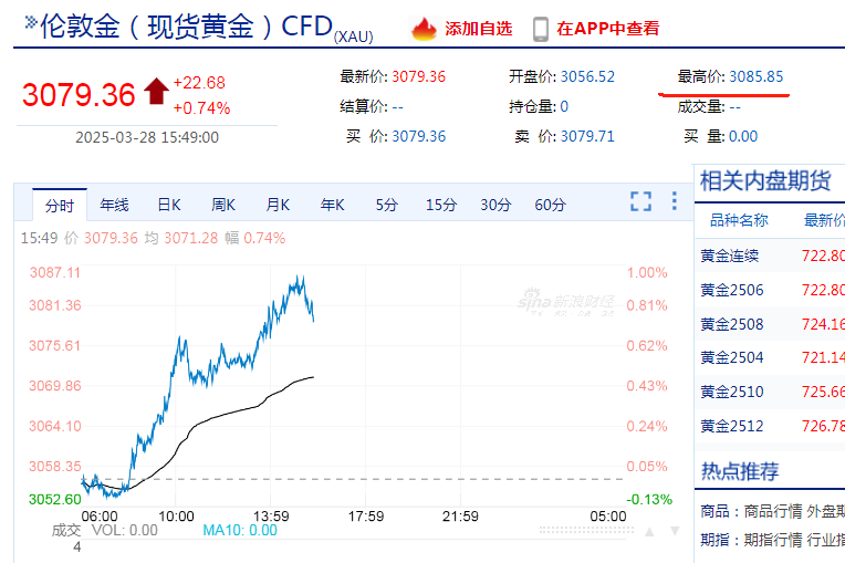 3月28日黄金价格再创历史新高,截至撰稿时,伦敦金价格盘中最高3085.85美元/盎司,纽约期金盘中最高3124.4美元/盎司(新浪财经数据)。市场人士普遍认为,地缘政治风险升级、贸易紧张局势升级、美联储降息预期升温、全球央行购金需求共同推动金价创新高,而市场避险情绪是主要推动因素。