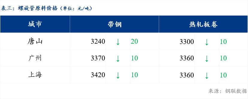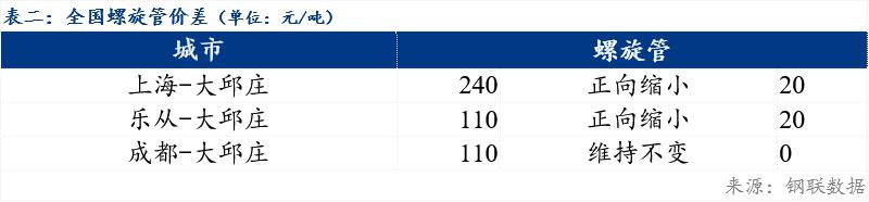 今日螺旋管南北价差较上一交易日小幅波动,华东区域与华北区域价差为240元/吨,华南与华北价差为110元/吨,西南与华北价差为110元/吨。