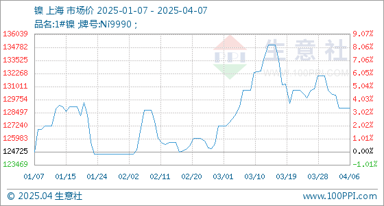4月7日,生意社镍基准价为128916.67元/吨,与本月初(130633.33元/吨)相比,下降了-1.31%。