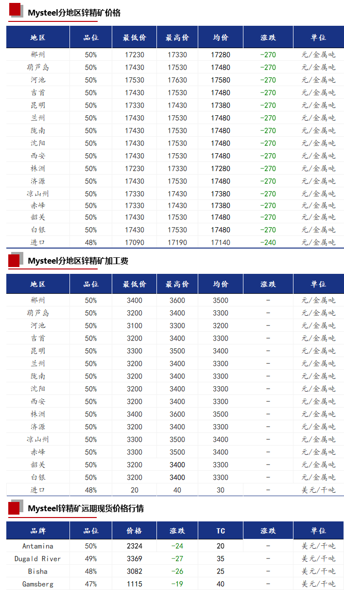 今日受锌价的影响,锌精矿价格下降270元/金属吨。国内锌精矿加工费各地区均未调整,和上一交易日持平。进口TC市场主流报价在20-40美元/干吨,和上一交易日持平。