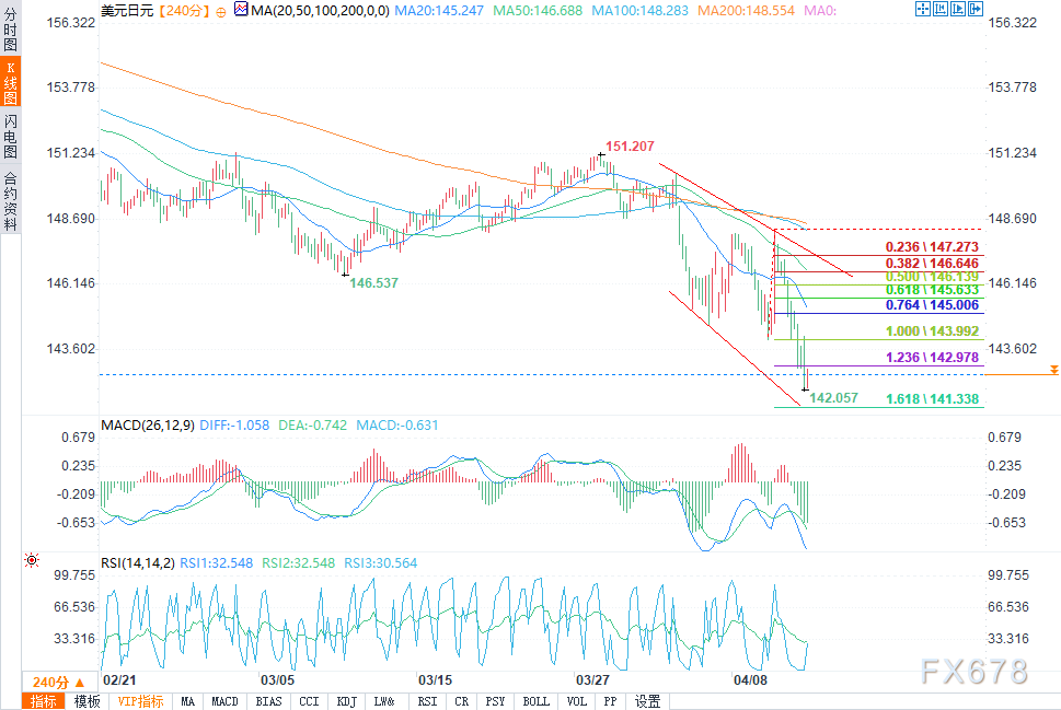 4小时图上,美元/日元持续下行,自高点158.871展开回调,截至目前最低下探至142.057,整体结构呈现出明显的空头趋势。