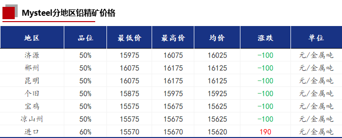 今日受铅价的影响,铅精矿价格跌100元/金属吨。国内铅精矿加工费各地区均未调整,和上一交易日持平。进口铅精矿价格较上一交易日涨190元/金属吨 。