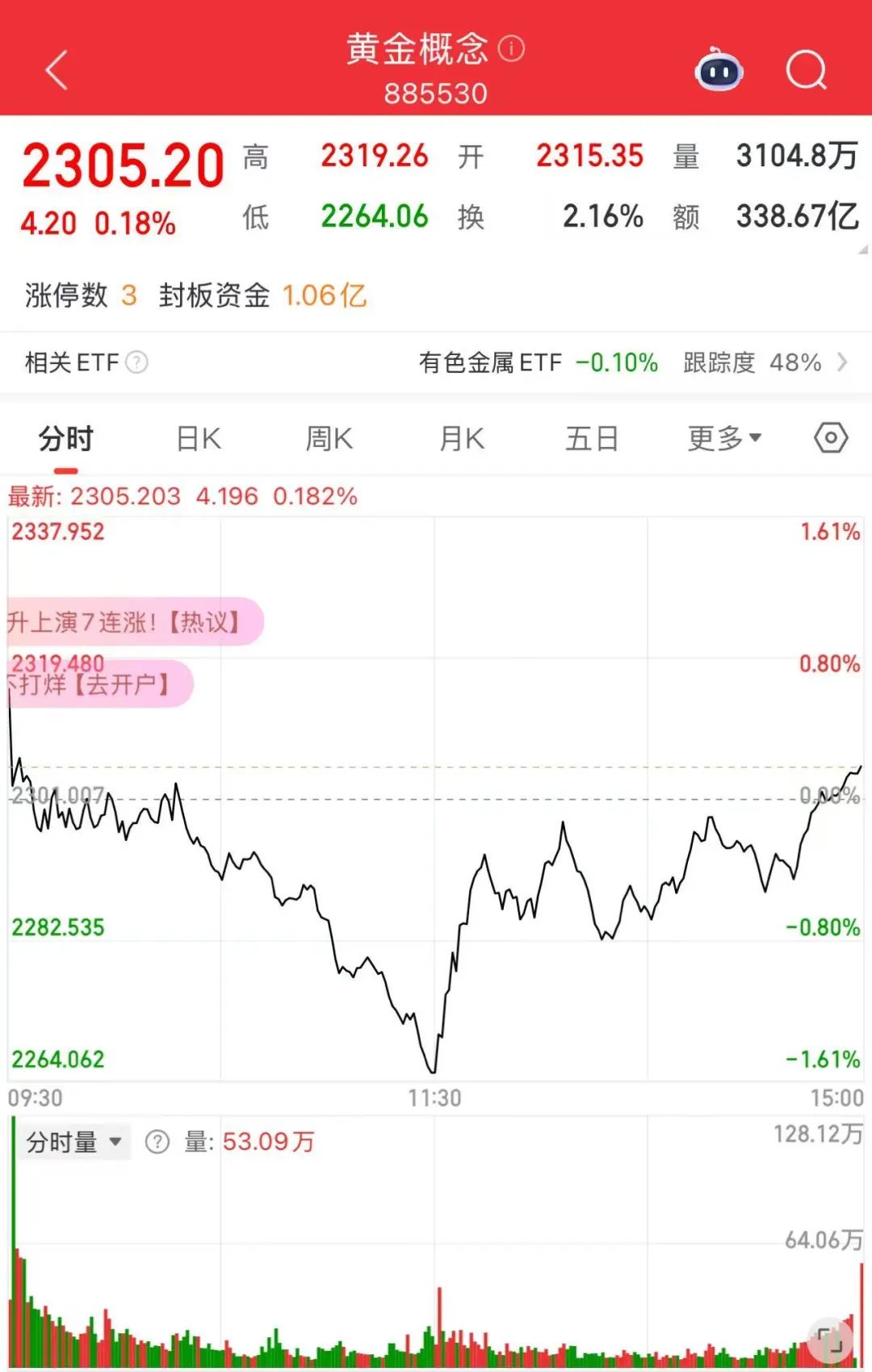 同花顺数据显示,4月16日,A股黄金概念板块呈现“V”字走势,最终微涨0.18%,收于2305.20点,成交额338.67亿元,换手率2.16%。有分析认为,早盘大幅下跌主要受短期获利盘抛压和市场情绪波动影响。午后大涨则受到国际金价盘中再创新高的直接带动。