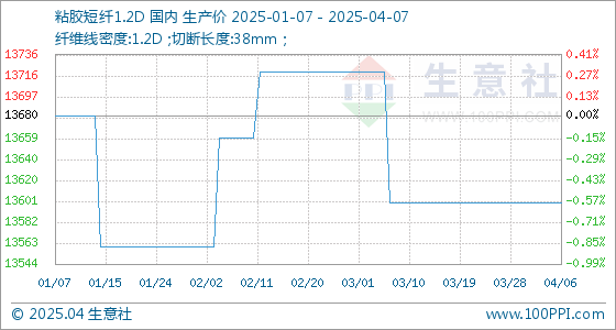 4月7日,生意社粘胶短纤1.2D基准价为13600.00元/吨,与本月初持平。