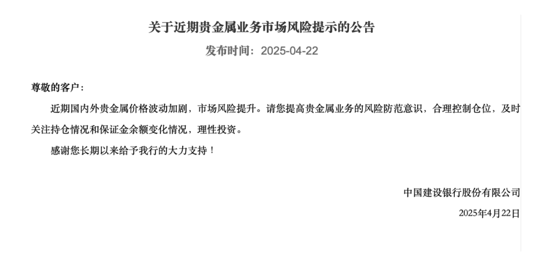同日,建设银行发布贵金属业务市场风险提示公告。