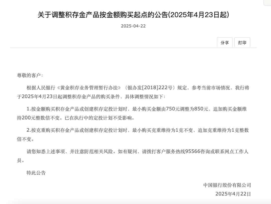 中国银行公告称,该行将于2025年4月23日起调整积存金产品的购买条件,按金额购买积存金产品或创建积存定投计划时,最小购买金额由750元调整为850元,追加购买金额维持200元整数倍不变。
