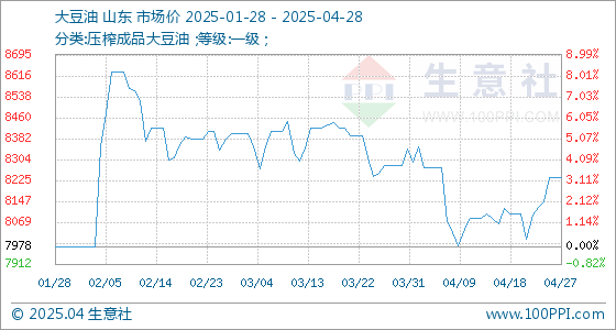 4月28日,生意社大豆油基准价为8236.00元/吨,与本月初(8342.00元/吨)相比,下降了-1.27%。