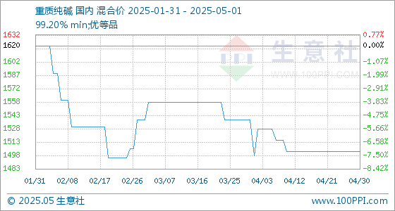 5月1日生意社重质纯碱基准价为1502.50元/吨