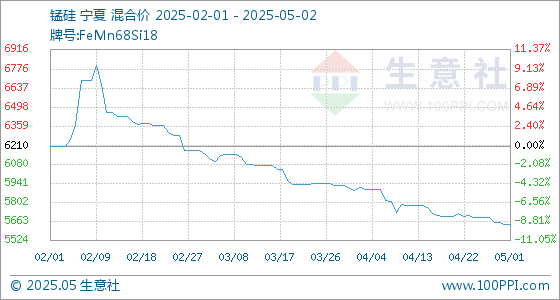 5月2日,生意社锰硅基准价为5640.00元/吨,与本月初持平。