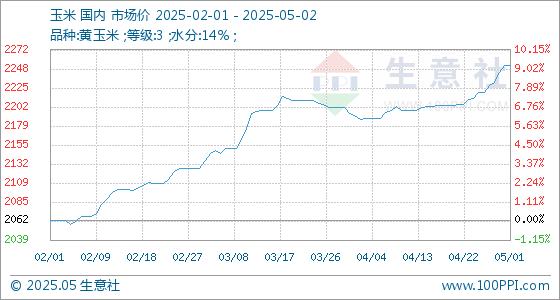 5月2日,生意社玉米基准价为2252.86元/吨,与本月初持平。