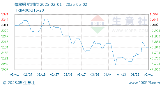 5月2日,生意社螺纹钢基准价为3183.22元/吨,与本月初持平。