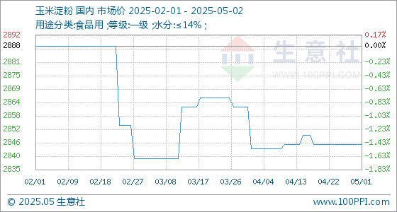 5月2日,生意社玉米淀粉基准价为2846.00元/吨,与本月初持平。
