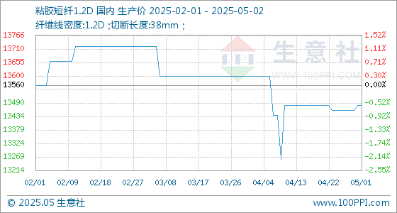 5月2日,生意社粘胶短纤1.2D基准价为13480.00元/吨,与本月初持平。